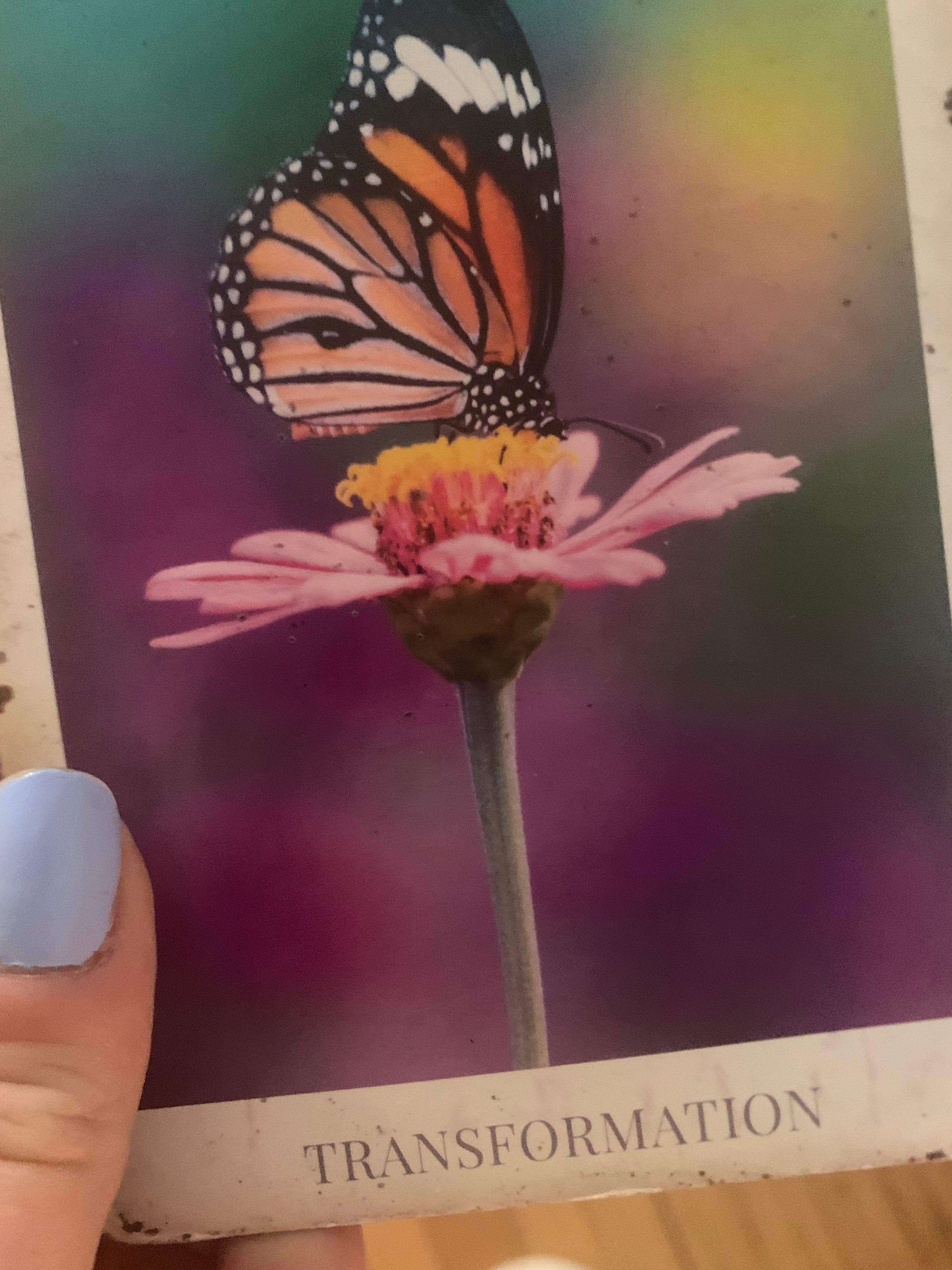 Yesterday, the morning after learning about this time, I also received the following message: “What’s been changing on the inside is about to start showing on the outside.” Interestingly enough, it alighted perfectly with the card I pulled at the end of my morning prayer - TRANSFORMATION. Wow, in this very image, I realize I have still been in the pupa or chrysalis stage.