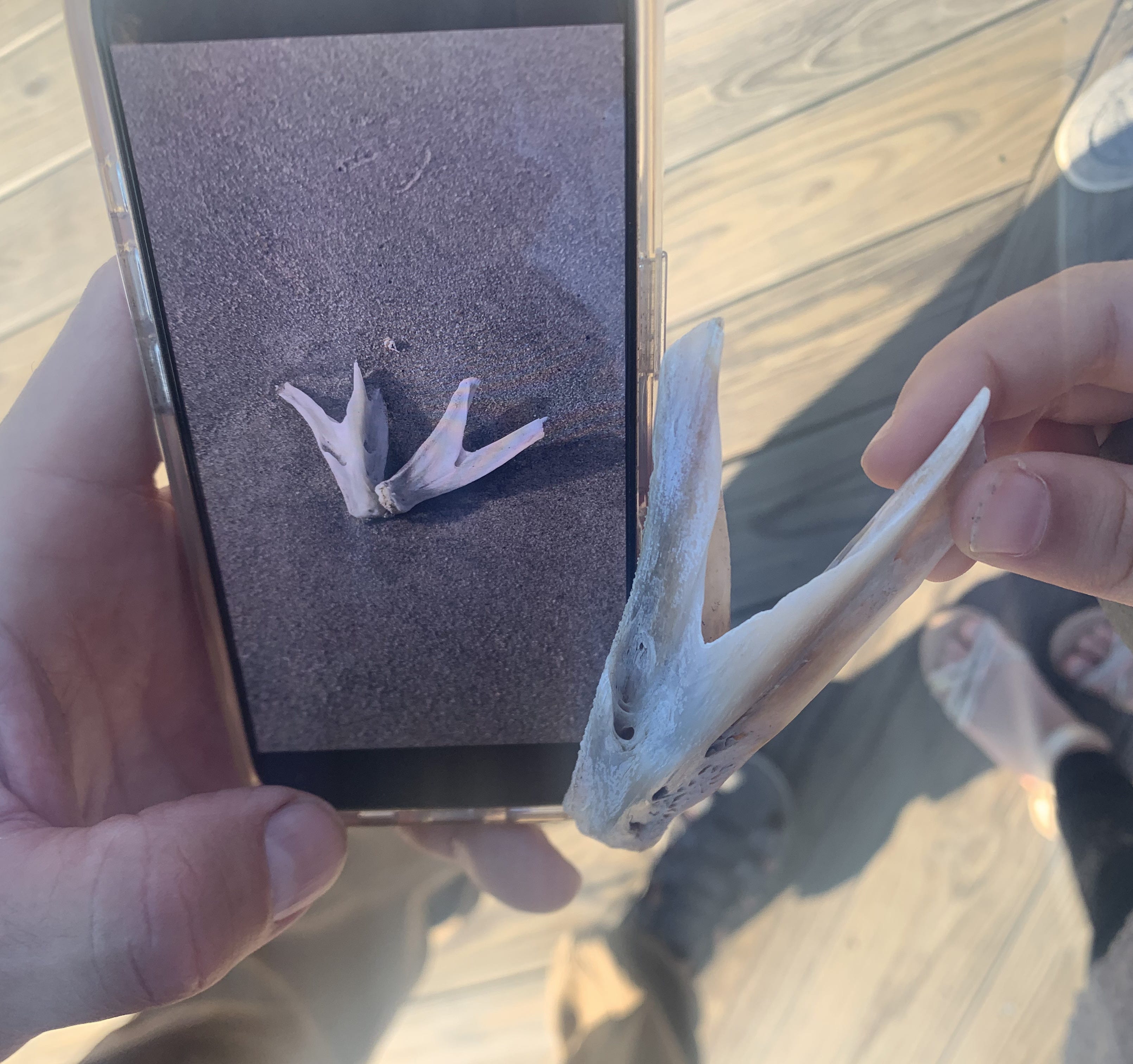 Within seconds of talking, we showed him the bone Melody found and Evans said he’d found two similar bones. In fact, he pulled up a photo on his phone to show us and sure enough, it was the same type of bone, which he imagined is from a type of fish, which would make sense.